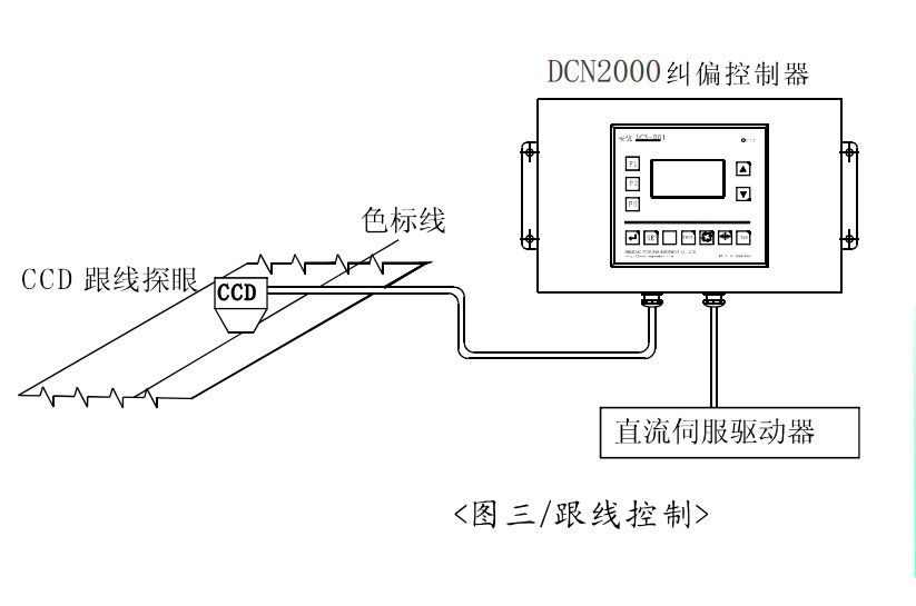 DCN-2000系列纠偏控制器是一款网络化、高精度数字式可以对片带状材料的边沿、中间线、色标线等位置进行自动控制的高性能电子仪器,其主要由控制板、液晶显示操作板、机箱等三部分组成,可以实现对片带状材料进行跟边控制、对中控制、跟线控制和复合控制。